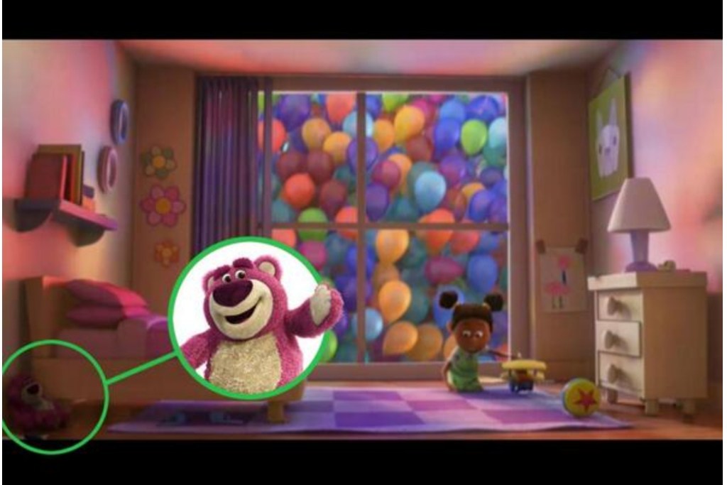 7. Nella stanza di una bimba possiamo notare l’orsacchiotto “Lotso” antagonista in “Toy Story 3”, uscito l’anno dopo UP.
