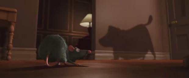 11. Sentiamo un cane che abbaia a Remy ma non lo vediamo. Dall’ombra si capisce che è Dug il cane di “Up” film uscito due anni dopo questo ma a cui alla Pixar stavano già lavorando.