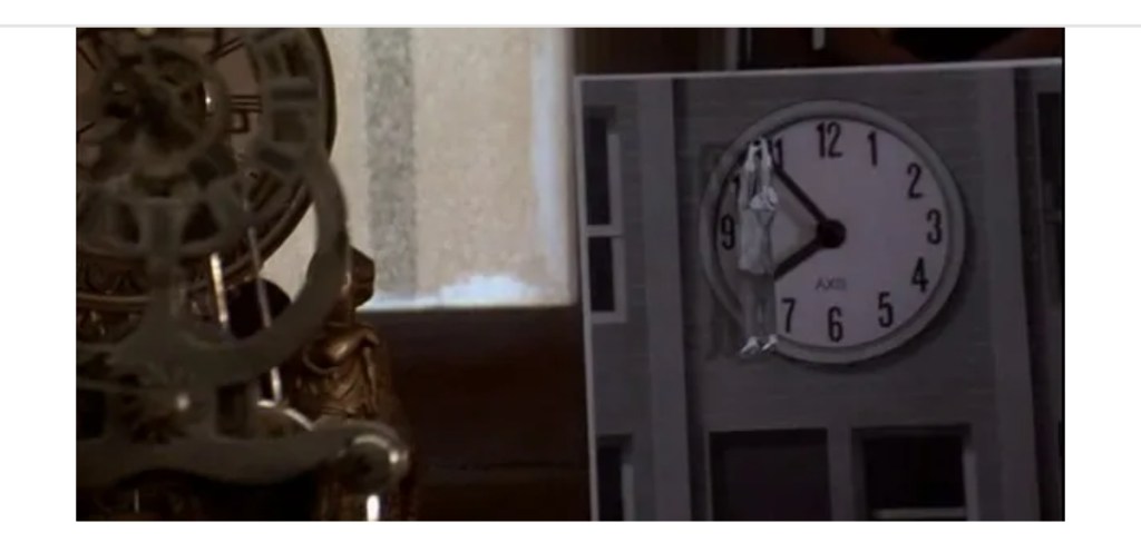 17. All’inizio scorgiamo il massiccio assortimento di orologi di Doc. Su uno di questi si nota la statuina di un uomo appeso alle lancette: è la star del muto degli anni venti Harold Lloyd, che penzola da un orologio nel suo ruolo più famoso in “Safety Last” del 1923. Questa è anche un’anticipazione della situazione analoga in cui si troverà lo stesso Doc appeso all’orologio di Hill Valley.